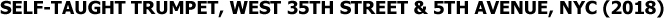 "Beginning Friday, July 20, 2018 at 3:00 PM on the North-West corner of West 35th Street and 5th Avenue I will begin teaching myself how to play the trumpet, an instrument I currently cannot play. Every time I practice I will only be at this designated location while I improve my playing ability with each practice session. I've always wanted to learn how to play the trumpet and realized in my current living situation it would be incredibly rude to teach myself a loud brass instrument indoors as I would annoy all of the other tenants in my apartment building. For a minute I thought about finding a practice space but soon realized basically anything goes in the streets of New York City as I experience and witness much more offensive, obscene, and annoying occurrences during my day-to-day. Beyond the personal enjoyment of teaching myself a new instrument I hope I can eventually entertain and bring smiles to the pedestrians of New York City with my trumpet playing." - Brandon Locher