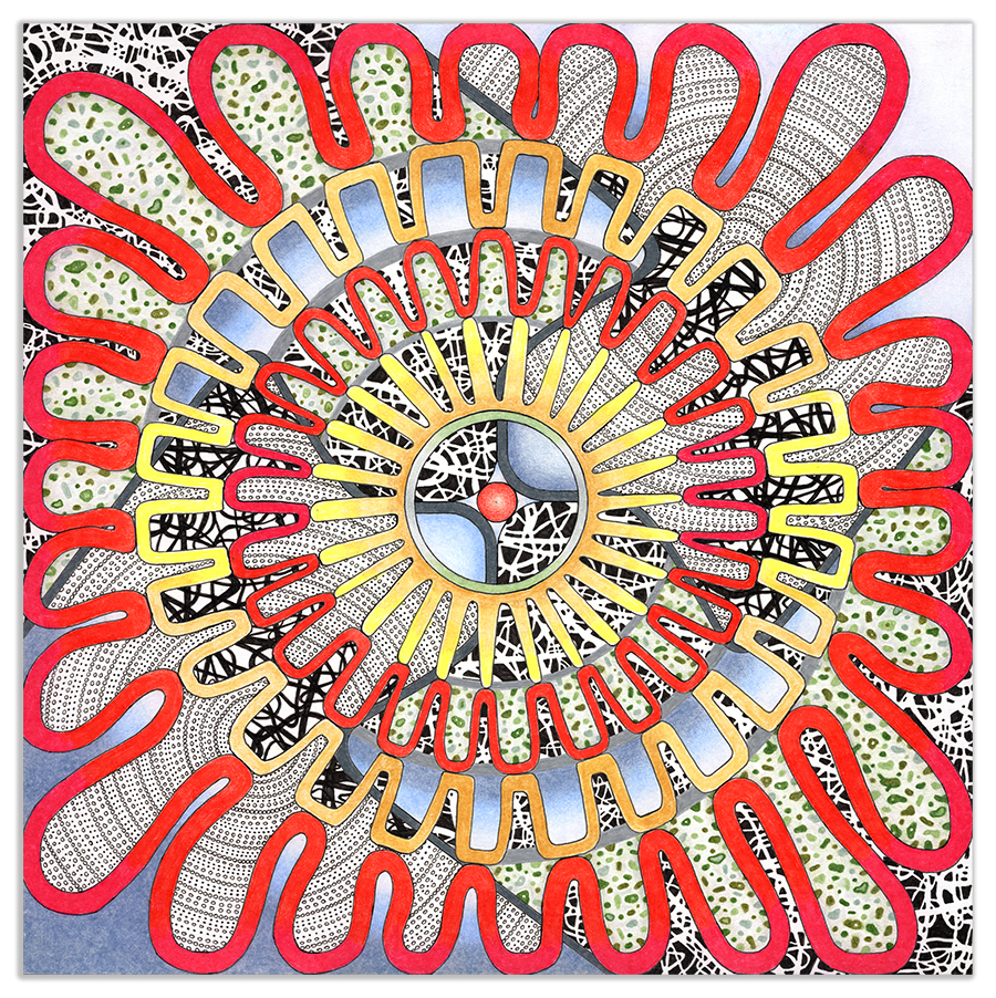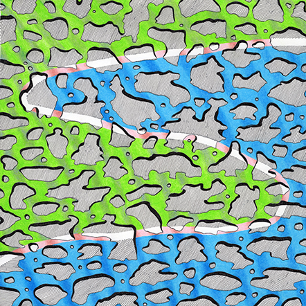 (left) Assemblage Material no. 13.5, Ink-Gouache and Colored Pencil on Paper, 8" x 8", 2024 (right) Assemblage Material no. 14, Ink-Gouache, and Colored Pencil on Paper, 8" x 8", 2024 |