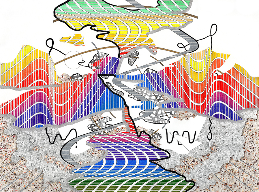 Assemblage Material no. 19, Ink-Graphite and Colored Pencil on Paper, 18" x 24", 2025 |